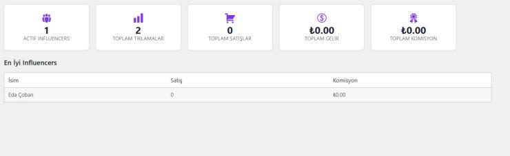 Eklentinin en güçlü özelliklerinden biri de influencer kullanıcılarına özel oluşturulan paneldir. Influencer’lar kendi giriş bilgileriyle sisteme erişebilir, referans linklerini görüntüleyebilir, tıklama sayılarını inceleyebilir, satış performanslarını takip edebilir ve toplam kazançlarını anlık olarak görebilir. Bu yapı hem marka tarafında şeffaflık sağlar hem de influencer tarafında güven oluşturur.