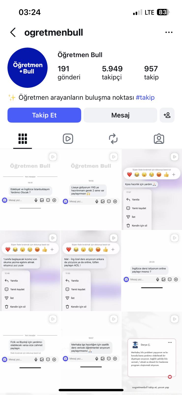 Öğretmenbull; öğrenci, öğretmen, psikolog ve diyetisyenleri bir araya getiren aktif bir platformdur. Bu nedenle sayfamızda paylaşım yapan işletmeler, tam olarak bu kitleye ulaşma fırsatı yakalar.